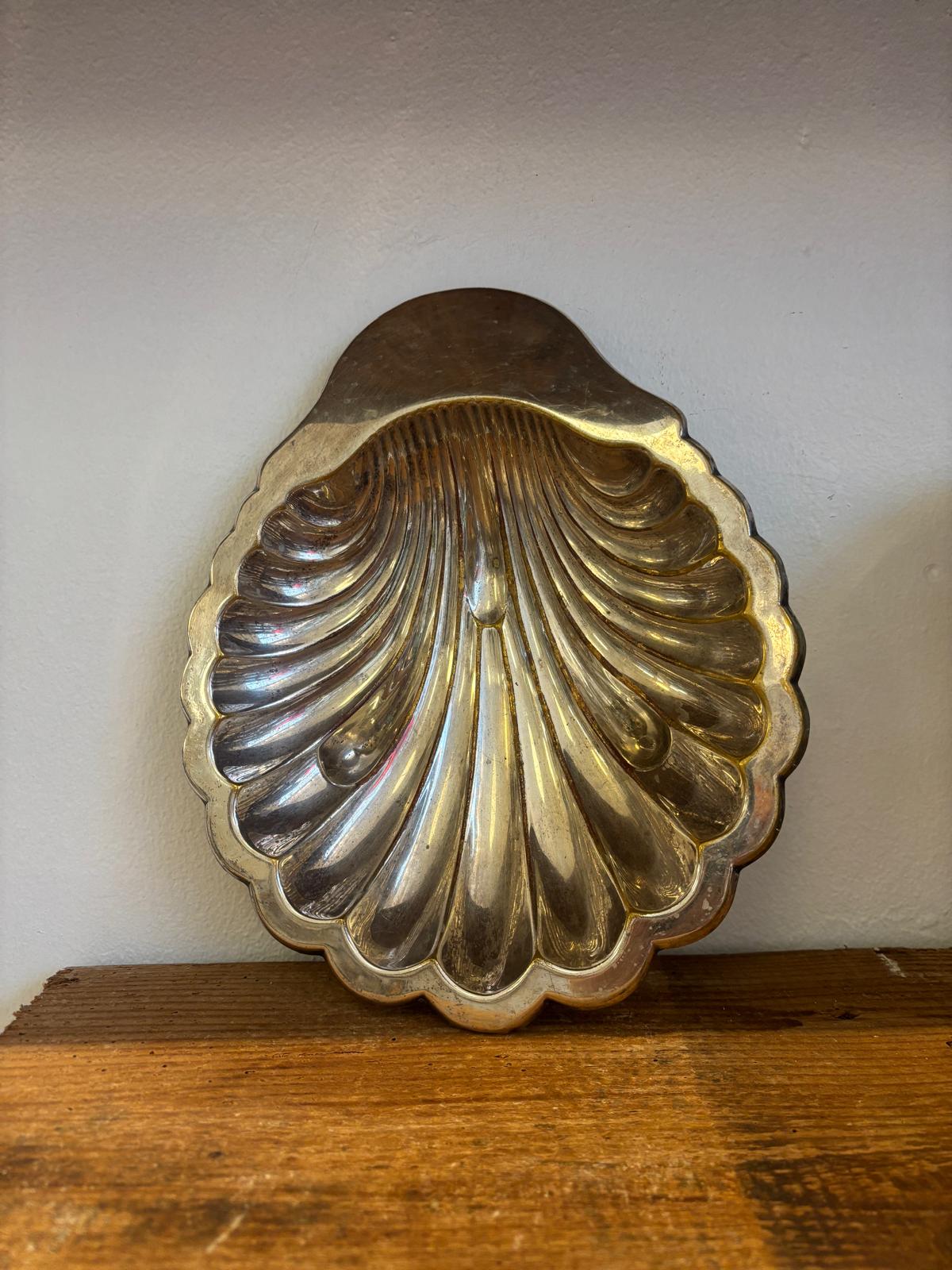 Mellemstørrelse forsølvet muslingefad med masser af flot patina. Den har små fødder på bagsiden, som blot ser ud som om at det er en del af selve muslingen.