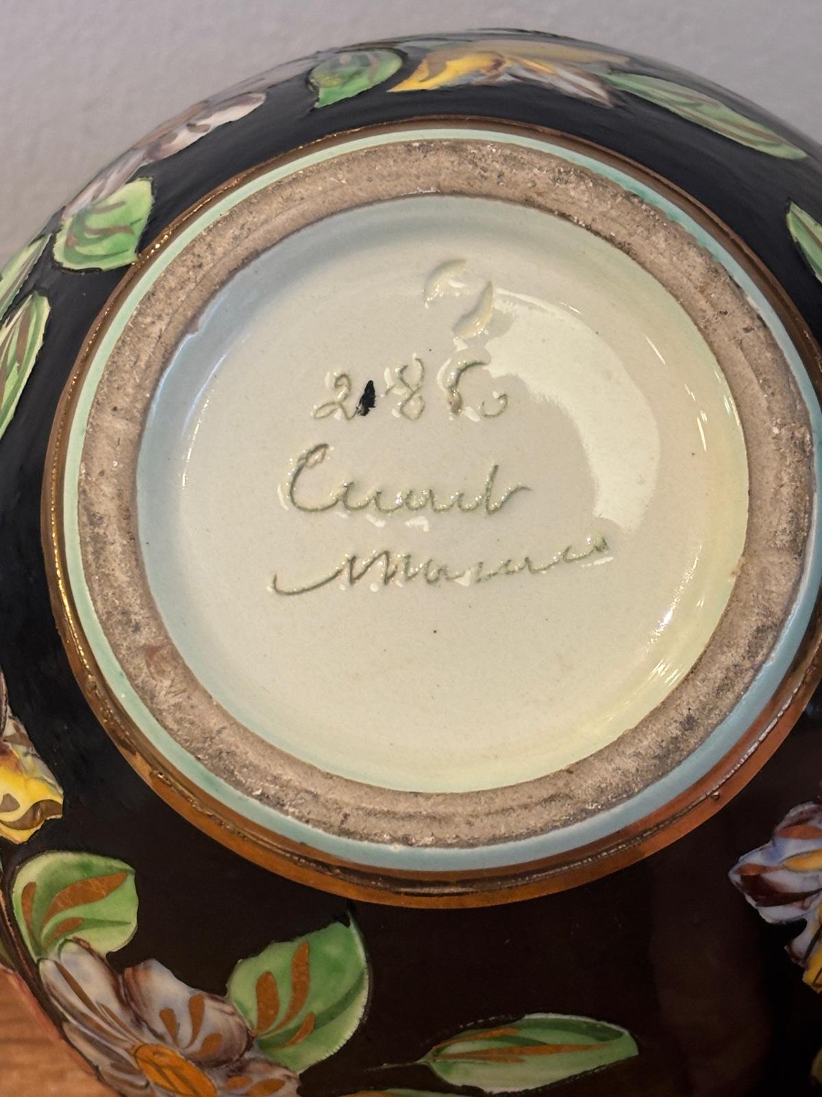 Smuk vintage vase fra Cerart Monaco, dekoreret med håndmalede blomster i stærke, levende farver mod dyb sort baggrund og med elegant guldkant langs åbningen. Fremstillet omkring 1955–1970 og typisk for Middelhavs-stilen fra Den Franske Riviera.
