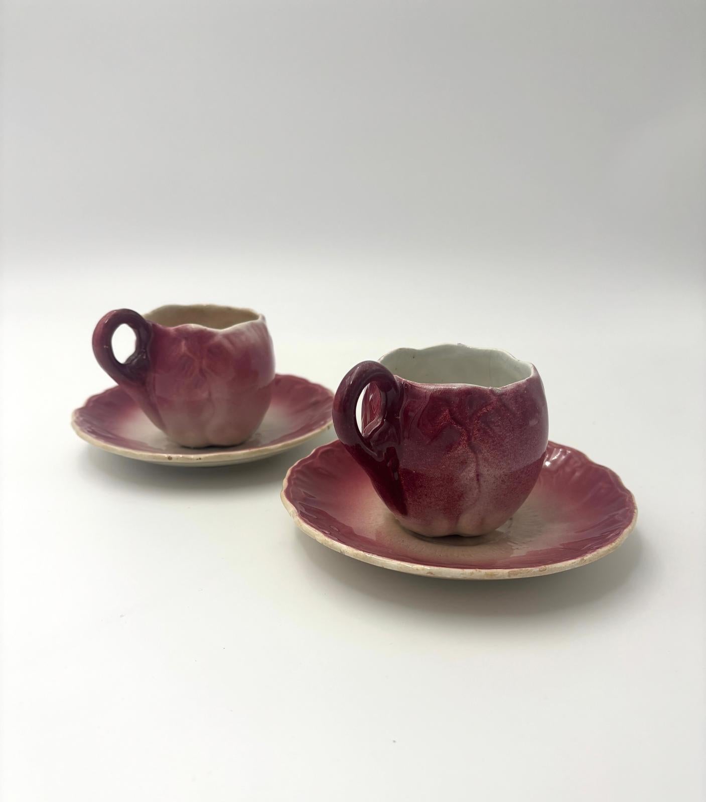 Sjældne fransk vintage kaffekop med underkopper, formet som blomster og glaseret i en sart, støvet lilla/rosa nuance med bløde overgange. Den organiske form og den karakteristiske løbeglasur er typisk for barbotine/majolica-stilen fra begyndelsen af 1900-tallet.